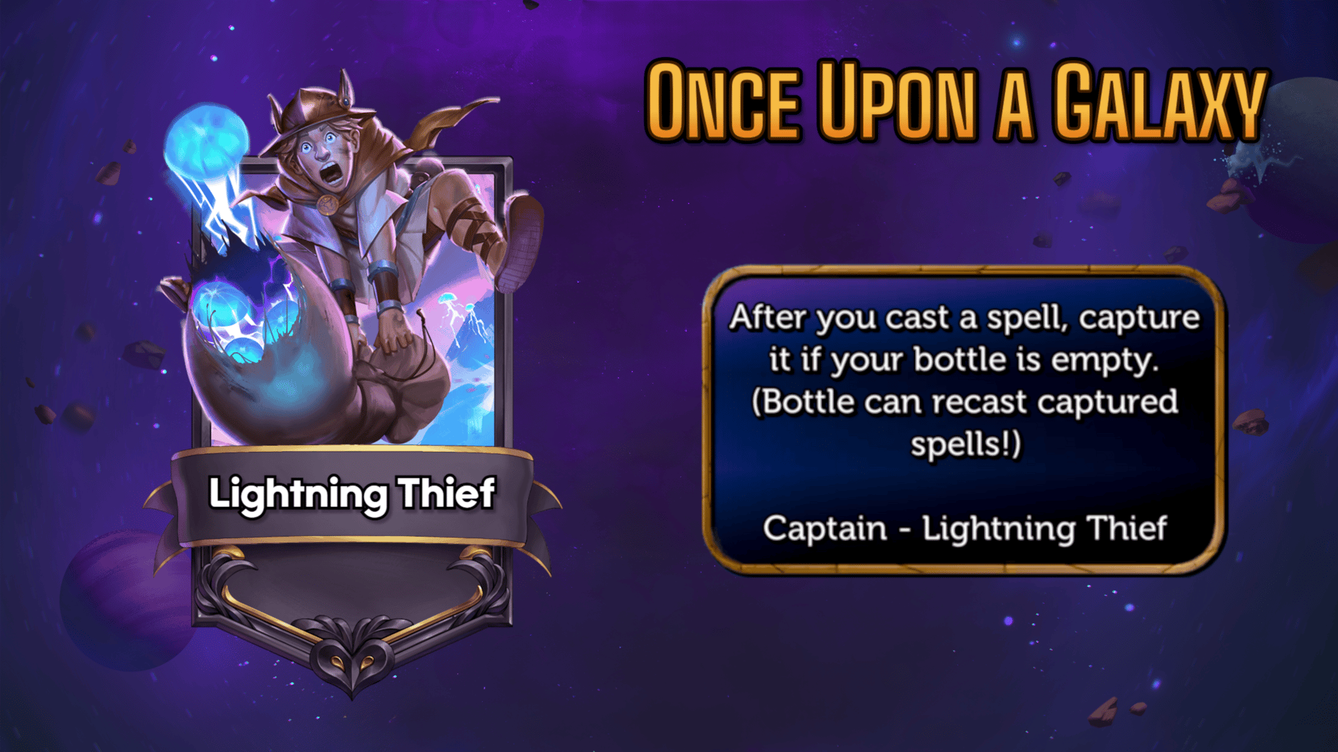 Born of storm and shadow, the Lightning Thief traps spells in enchanted bottles. Each bottle holds a spark of chaos, ready to strike at just the right moment.